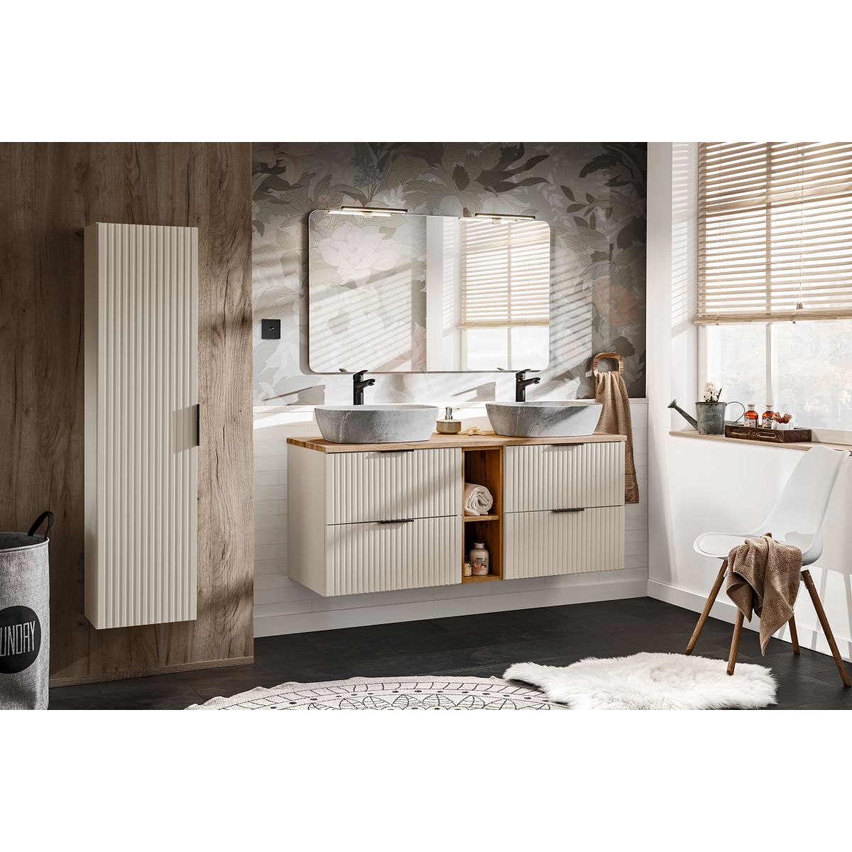 I colori cashmere opaco e rovere wotan conferiscono al set un carattere elegante che si adatta perfettamente a qualsiasi bagno moderno. I frontali con fresature verticali conferiscono un aspetto unico al set, sottolineandone l'originalità.