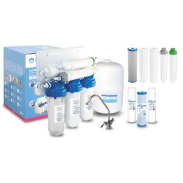 Un classico sistema a osmosi inversa dotato di una membrana osmotica da 75 GBP (il sistema consente di ottenere fino a 280 litri di acqua depurata al giorno) e di un serbatoio da 8 litri.