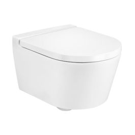 Il set comprende un vaso bianco Roca Inspira Compacto Rimless (senza collare di risciacquo) e un sedile autoportante con funzione di sgancio facilitato.