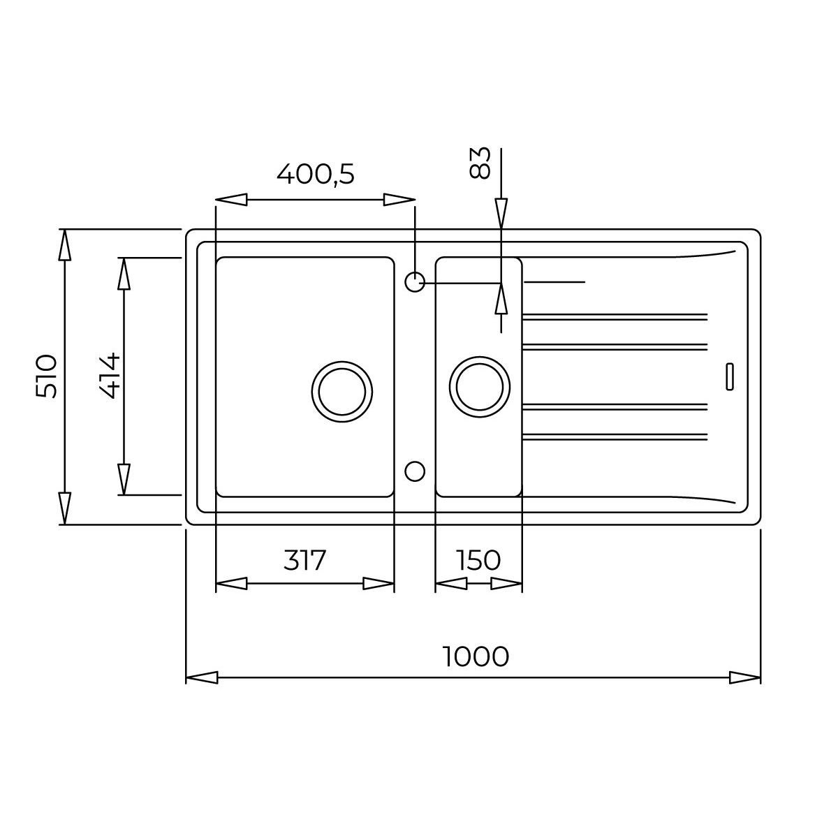 - lavello fornito senza fori; i fori devono essere realizzati autonomamente; possibilità di praticare fino a 2 fori