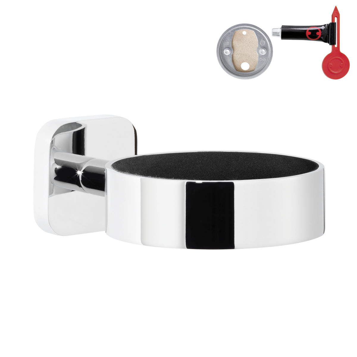 Un'attrazione per gli occhi grazie alla combinazione di linee semplici e curve dolci con il metallo cromato lucido. I materiali di alta qualità, l'impermeabilità e l'acciaio inossidabile garantiscono una lunga durata dell'appendiabiti. L'inserto in gomma nera protegge l'asciugatrice dai graffi. Il montaggio con una soluzione autoadesiva affidabile e quindi senza l'uso di trapano e tasselli garantisce che la superficie di montaggio rimanga intatta. Il supporto per asciugacapelli può essere rimosso rapidamente in qualsiasi momento. Il rimontaggio è altrettanto semplice e richiede solo un nuovo adattatore BK20.
