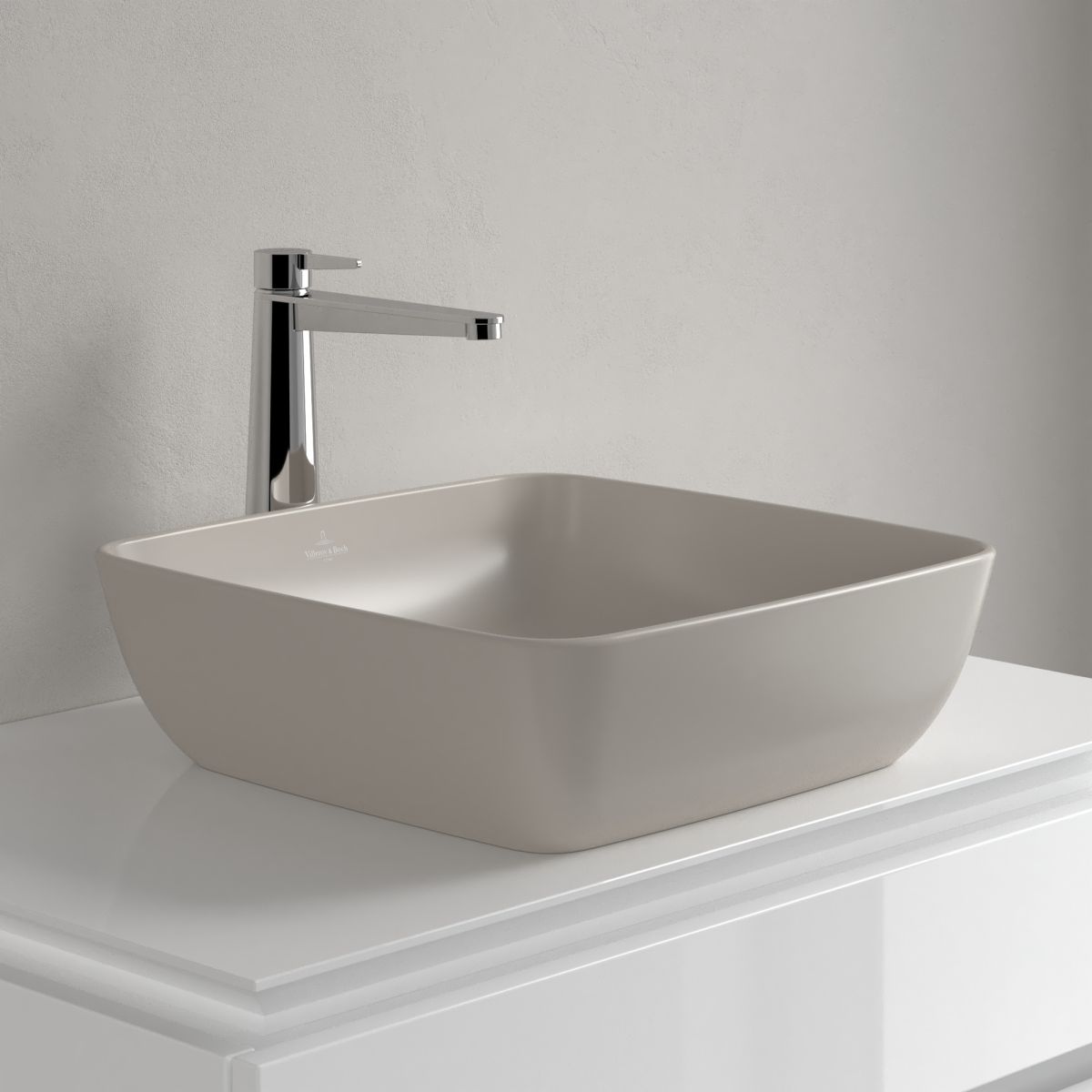 Il lavabo quadrato da appoggio della collezione Artis di Villeroy & Boch colpisce per le pareti particolarmente sottili e i contorni delicati grazie all'innovativo materiale TitanCeram, che rende anche i lavabi con bordi stretti estremamente resistenti e durevoli. Il lavabo ha anche una comoda profondità di 10 cm, che rende molto comodo lavarsi le mani e protegge lo spazio intorno al lavabo dagli schizzi. Grazie alla superficie resistente allo sporco, la pulizia è estremamente facile. La moderna finitura opaca su tutta la superficie è perfetta come accento di design. Insieme ai mobili abbinati della collezione Legato o Finion, il lavabo diventerà il vero protagonista del bagno.