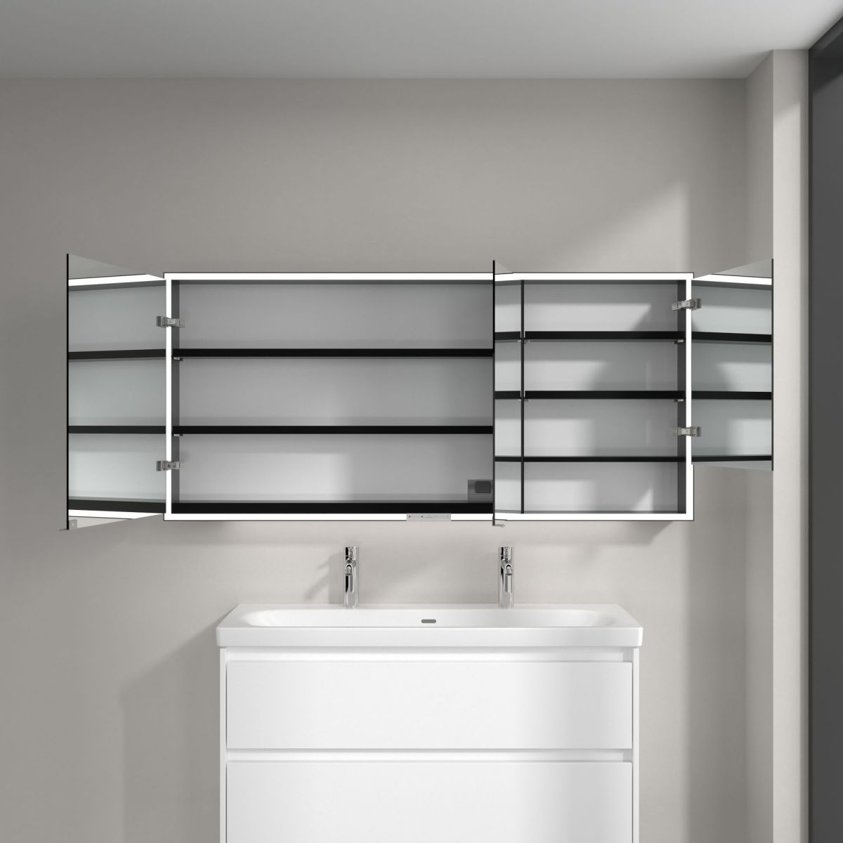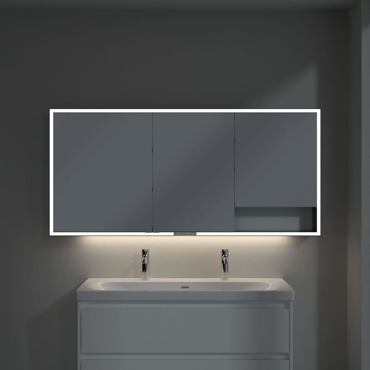 La striscia LED che circonda lo specchio garantisce un'illuminazione uniforme, mentre l'illuminazione integrata del lavabo e gli scomparti aperti illuminati creano un'atmosfera suggestiva. La luminosità e la temperatura del colore possono essere comodamente regolate tramite un sensore o un controller Smart Home. Le delicate maniglie consentono di aprire comodamente le ante senza lasciare impronte, mentre la doppia presa al centro offre ulteriore funzionalità.
