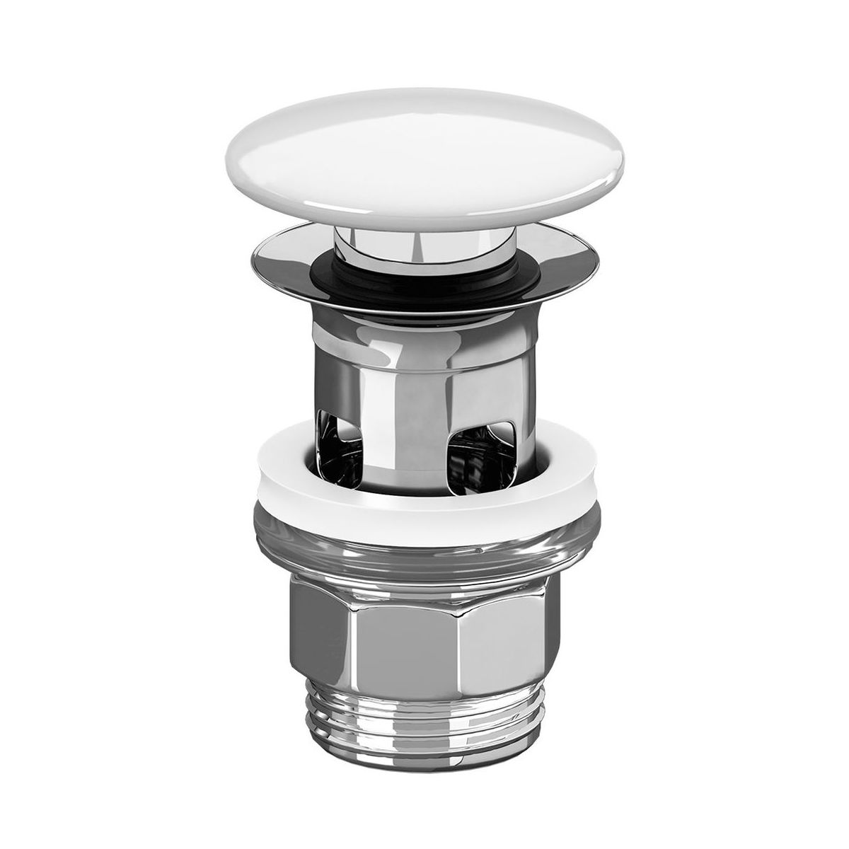 Rubinetto destinato all'abbinamento con lavabi con troppopieno. Si tratta di un tappo a scatto, quindi per liberare/tappare lo scarico è sufficiente premere. È dotato di un cappuccio in ceramica color Weiss Alpin 01, quindi è ideale in combinazione con lavabi bianchi, poiché non crea contrasto cromatico. Il rubinetto è completamente a tenuta stagna.