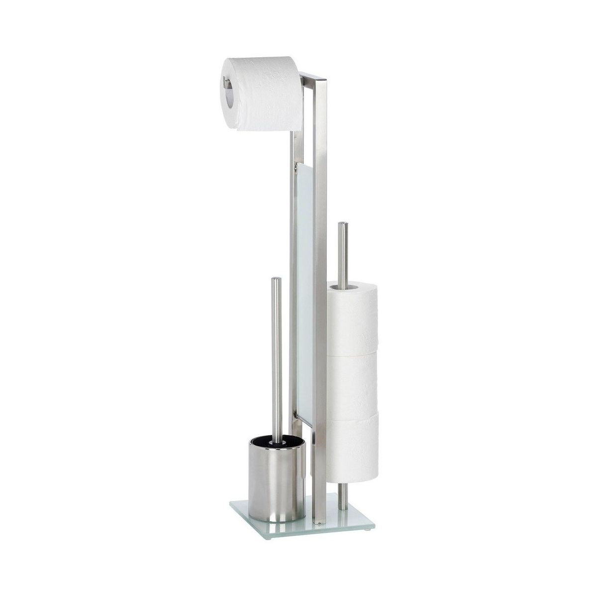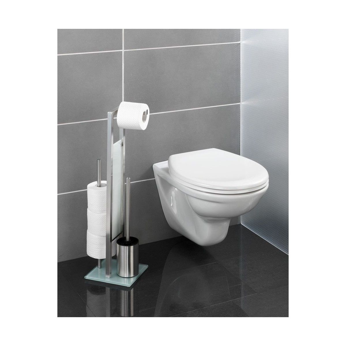 Il supporto da bagno indipendente (3in1) è dotato di un porta carta igienica, un porta rotolo (fino a 4) e uno scopino. Il comodo supporto consente di posizionare la carta e lo scopino nello stesso punto.