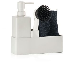 - il set include un dispenser di sapone in ceramica, uno spazzolino con testina sostituibile e un organizer con panno