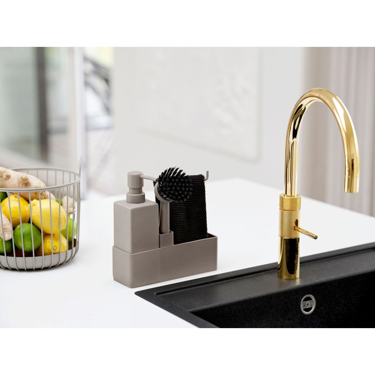 - il set include un dispenser di sapone in ceramica, uno spazzolino con testina sostituibile e un organizer con un panno